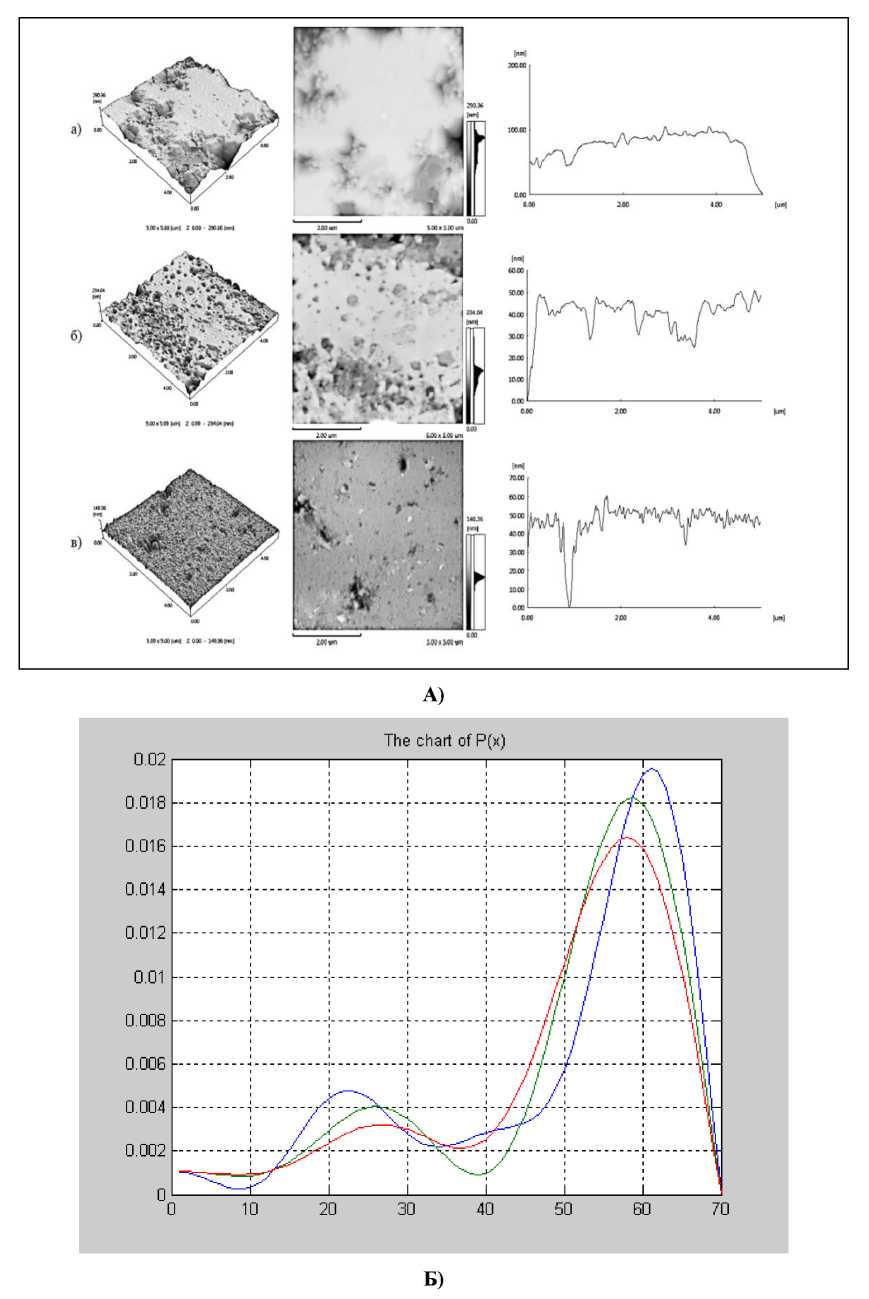 На рис. 1А приведен снимок топологии и графики распределения глубин пор мембран на центральной линии структур. Мембраны имеют размеры 5 на 5 мкм. Измеренные параметры зависят от температуры разделяемых газов; молекулярного веса и давления; размера пор, фрактальной размерности, характеризующей топологические особенности строения микроструктуры. Глубинные профили мембран по измеренным выборкам идентифицируются разработанными методами как одномерные полимодальные распределения – рис. 1Б. Для идентификации распределений использован созданный авторами комплекс программ в системе MATLAB. Как видно, одномерные плотности распределения глубин пор – полимодальны с максимальным количеством высших мод до 4-5. Полимодаль-ность отражает фрактальность характеристик мембран, что обуславливает сложные связи механических, диффузионных и других химических свойств изучаемых мембран [7]. Рис. 2А дополняет рис. 1 аналогичным изображением для значительных концентрации ПОСС (в 1 масс. %, 2 масс. % и 5 масс. %) и иллюстрирует 3D-график глубинного профиля периодической эталонной мембранной структуры с матрицей данных 512×512 пикселей. Эта мембрана характеризуется бимодальными плотностями распределения глубинного профиля в сечениях вдоль оси X.