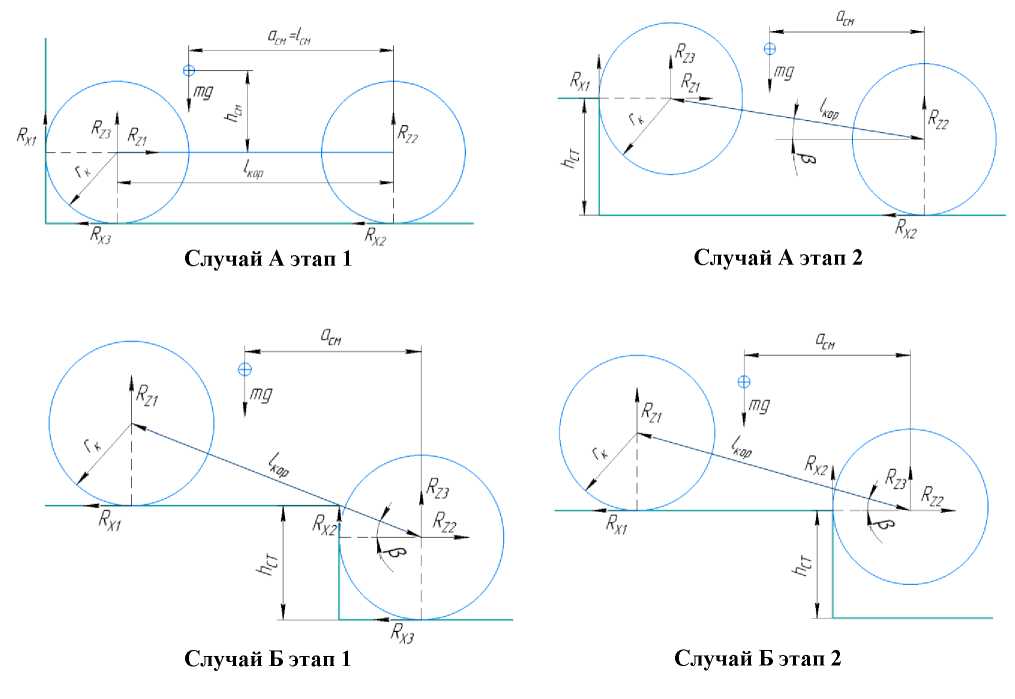 Очевидно, что возможности преодоления вертикальной ступени определяется, в том числе, текущим расположением центра масс. С целью решения задачи по определению требуемого для преодоления неровности положения центра масс машины и потребный крутящий момент двигателей предложен аналитический метод исследования профильной проходимости, основанный на уравнениях статического равновесия. Для учета реактивного крутящего момента и возможности изменения положения центра масс машины была составлена расчетная схема (рис. 2). Весь процесс преодоления препятствия предлагается разделить на два случая, каждый из которых имеет два этапа.