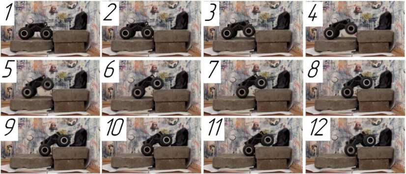 Натурный эксперимент для образца с исходными параметрами (табл. 1) подтвердил аналитическое решение – машина не может преодолеть второй этап заезда по причине недостаточного сцепления движителя с опорным основанием – наблюдается безрезультатное буксование (рис. 9). Опрокидывания не происходит.