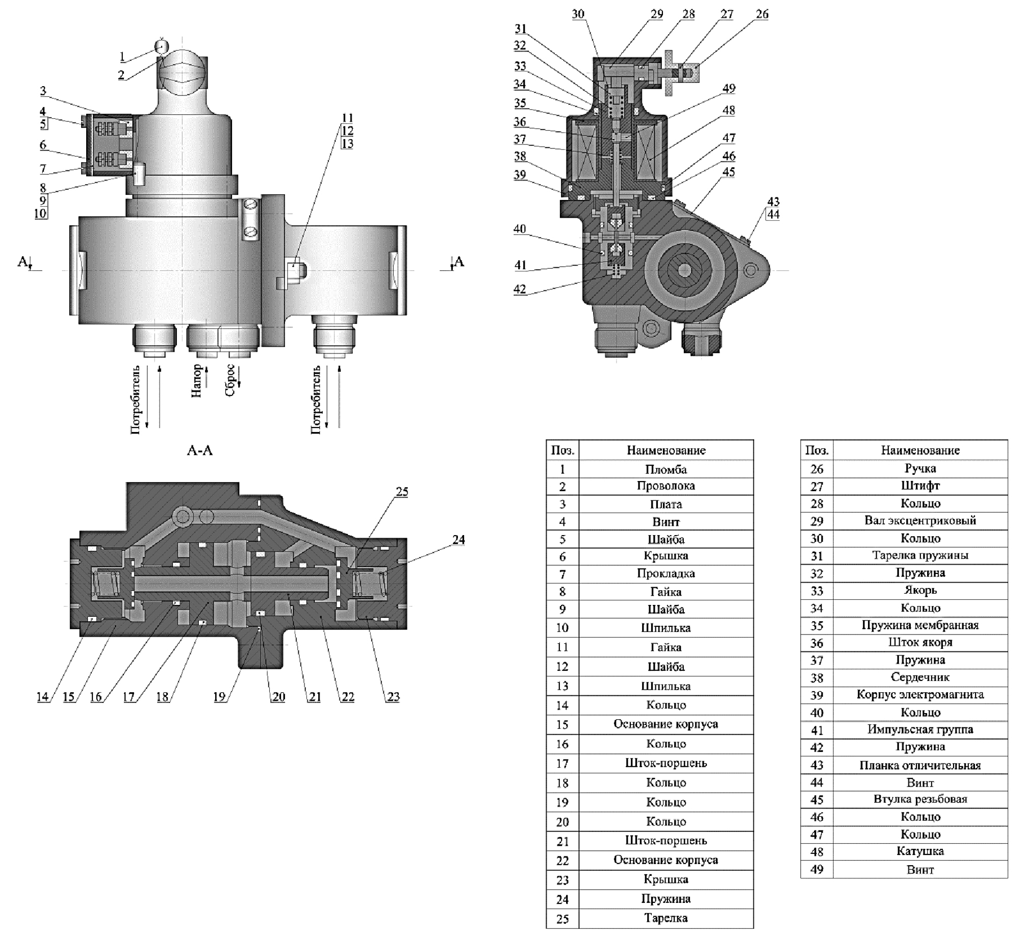 Таким образом, при отключенном электромагните проводимая среда из напора (штуцер «1») попадает к потребителю (штуцер «3»), а потребитель (штуцер «4») соединен со сбросом (штуцер «2»).