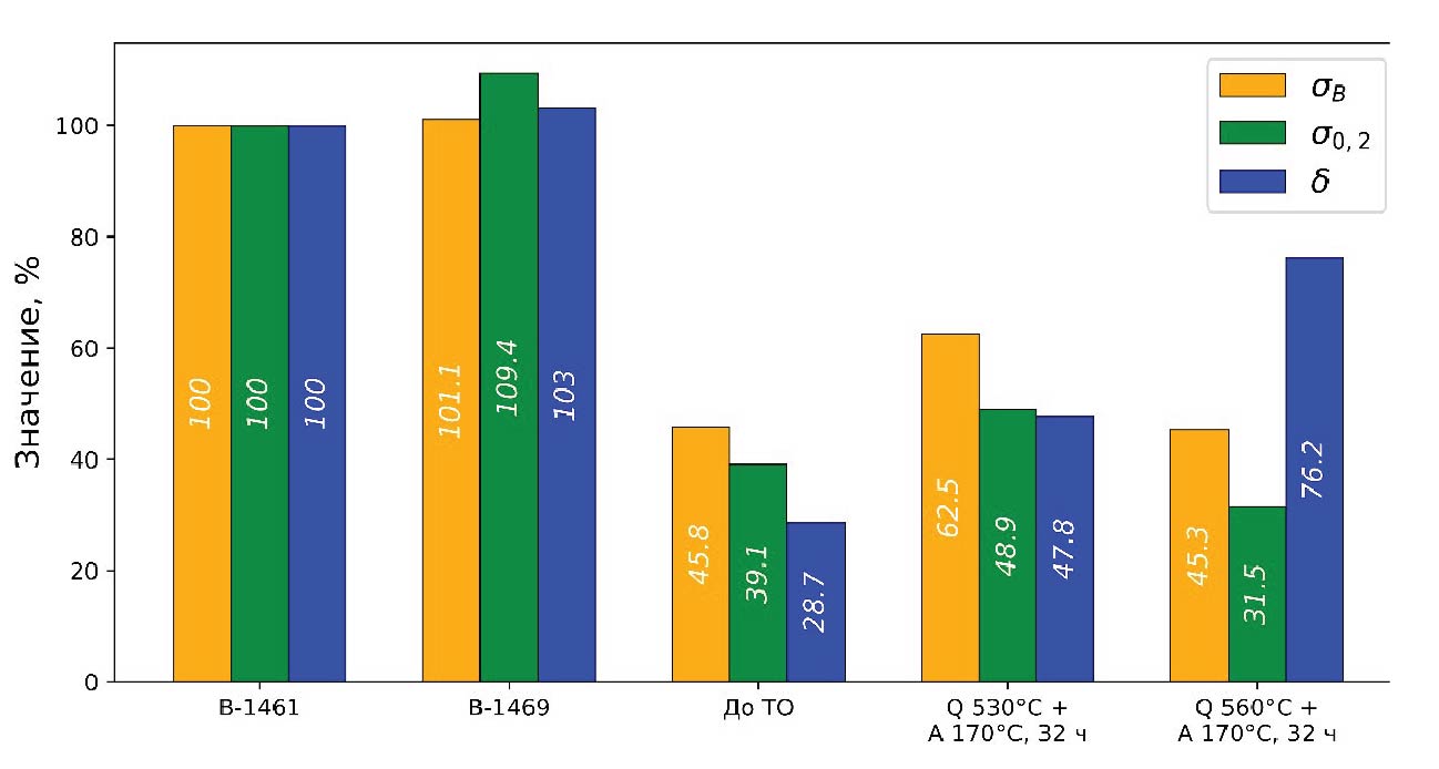 Рис. 2. Результаты испытаний на растяжение (Q — закалка, A — старение).
