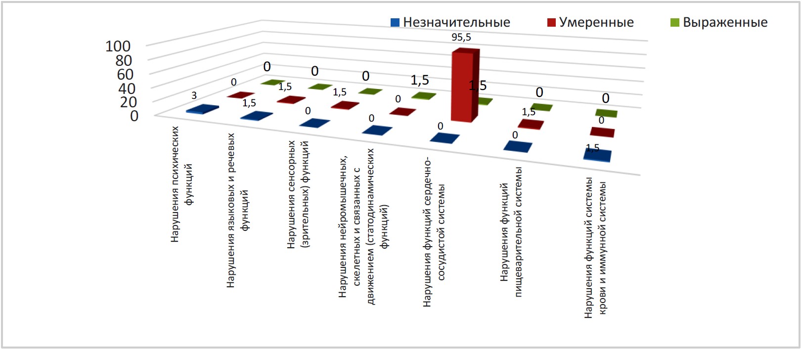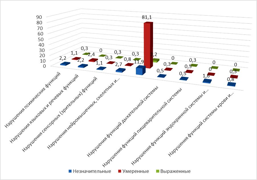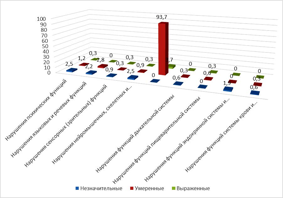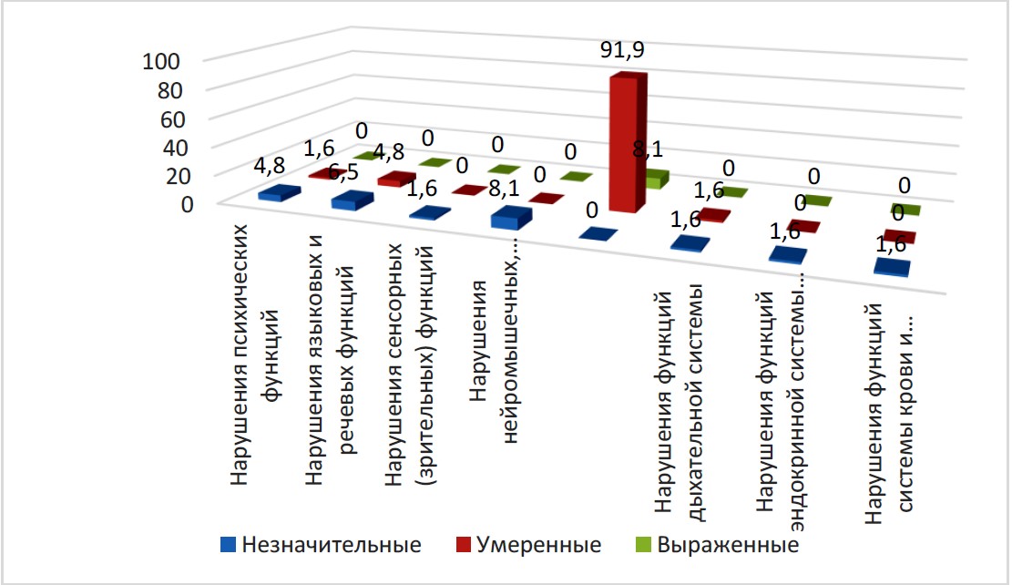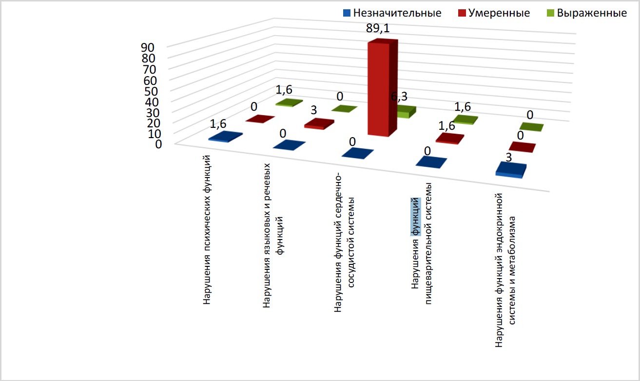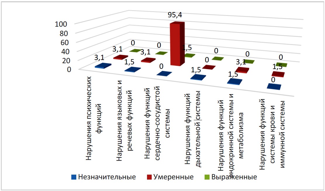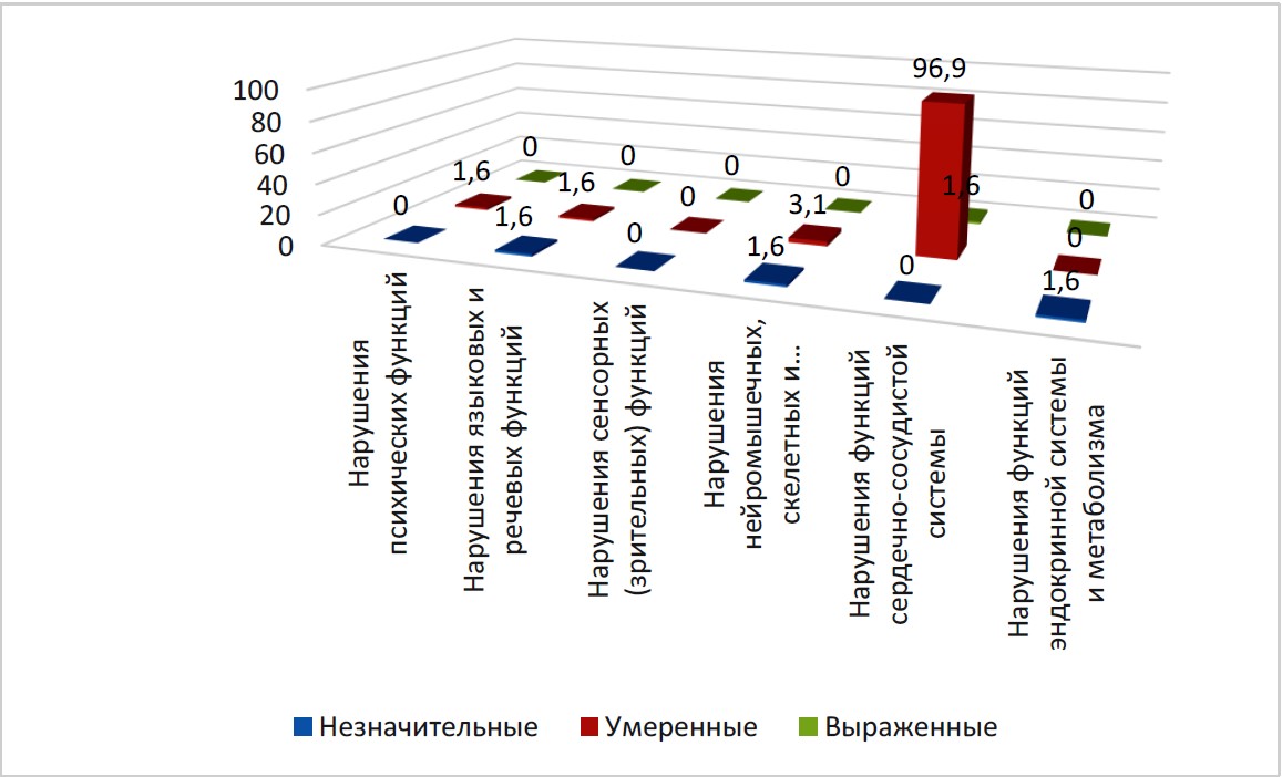 Помимо нарушений функций сердечно-сосудистой системы, у детей отмечены нарушения психических функций b110-b199 – у 4,0 % (из них 2,5 % – незначительные, 1,2 % – умеренные, 0,3 % – выраженные), нарушения языковых и речевых функций b310-b399 – 5,0 % (из них 2,2 % – незначительные, 2,8 % – умеренные).
