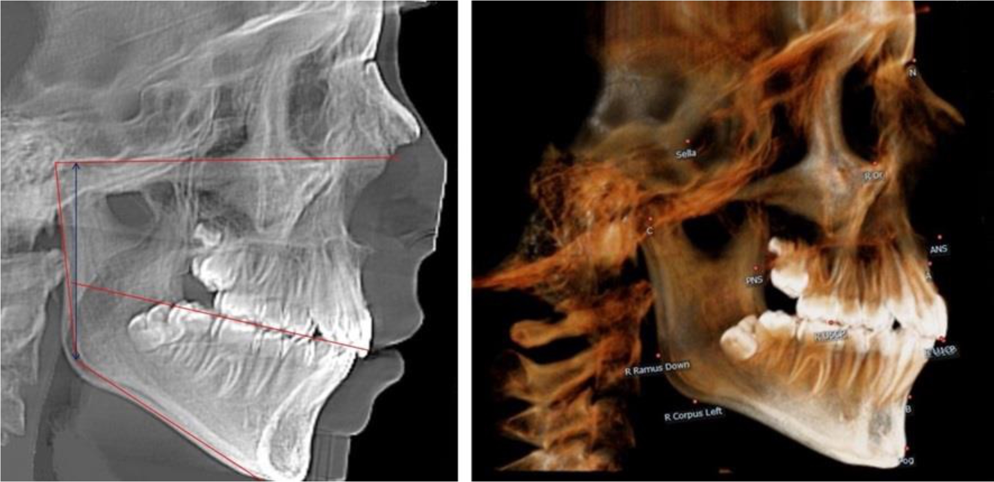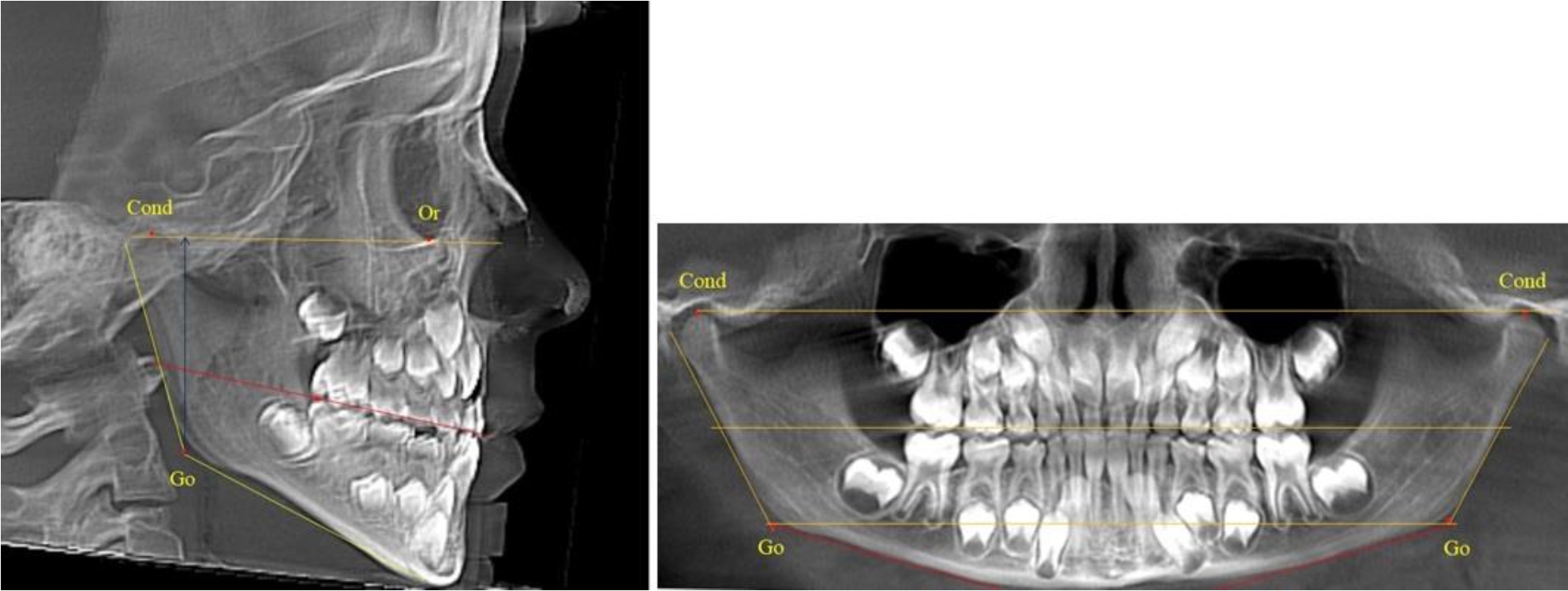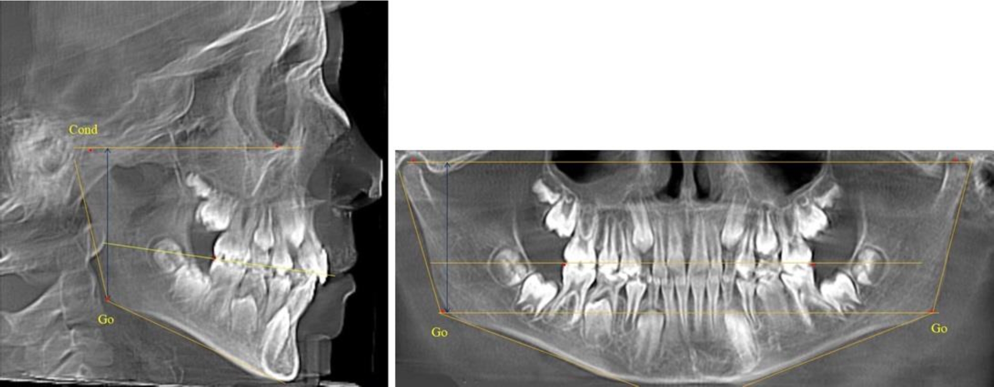 На ортопантомограмме точки Cond соединяли между собой суставной линией Cond-Cond. Касательная к ветви нижней челюсти соединяла выступающие точки, которые соединялись в области угла и определяли положение точки гонион Go с обеих сторон, которые соединяли гониональной линией Go-Go.