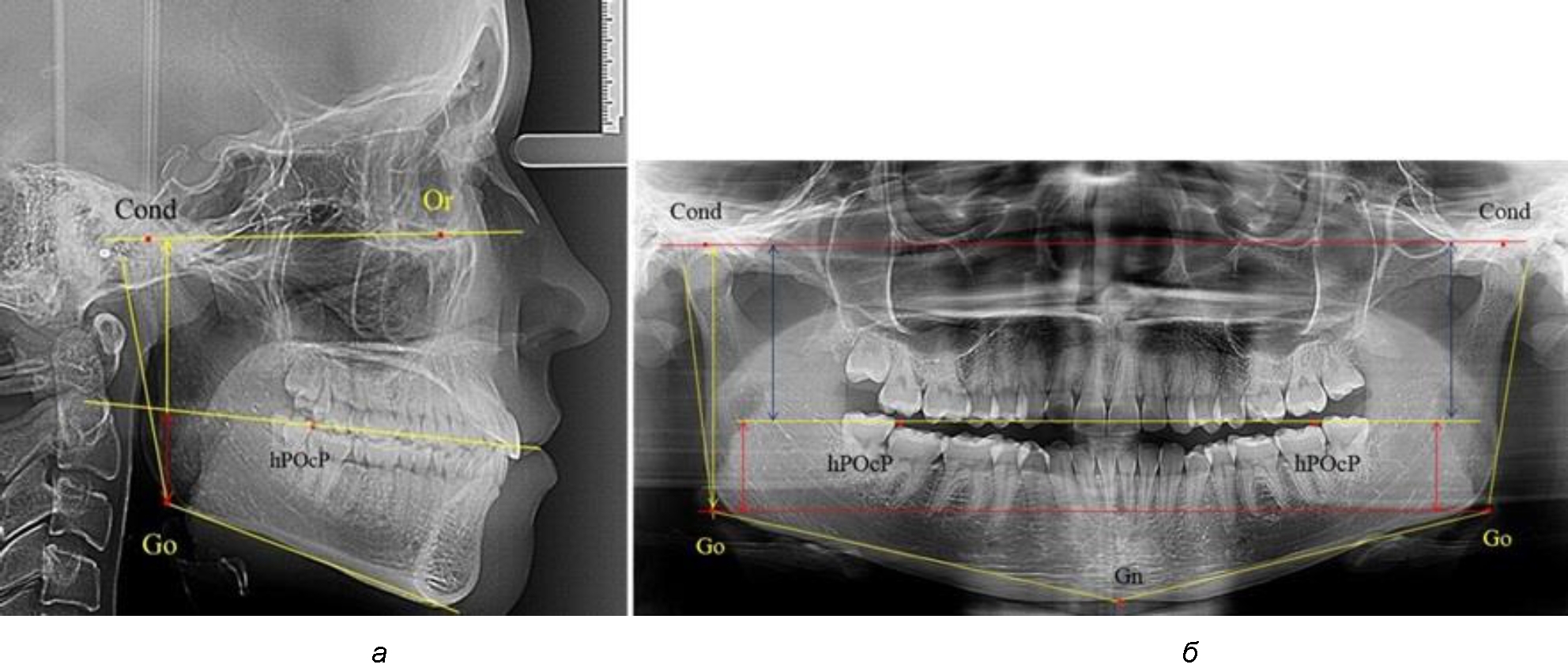 Рис. 1. Метод измерения высоты ветви нижней челюсти на телерентгенограмме (а) и ортопантомограмме (б)