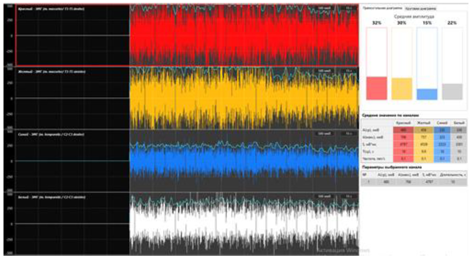 В статистическую обработку брались только количественные данные, такие как средняя амплитуда в мкВ. Соответствие нормальному распределению проверялось с помощью теста Шапиро – Уилка, так как в каждой выборке было по 40 и 37 наблюдений. Так как распределение всех показателей соответствовало нормальному, для описания использовали среднюю арифметическую и стандартное отклонение M(SD), а для сравнения показателей в основной и контрольной группах – двухвыборочный критерий Стьюдента. Все расчеты проводились с достоверностью 95 %.