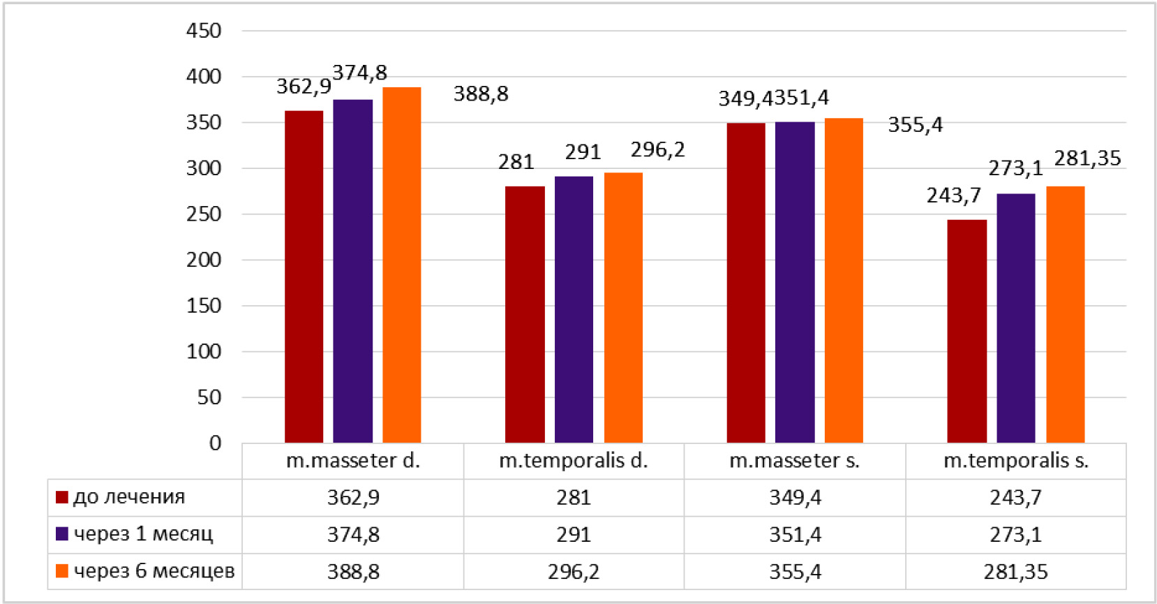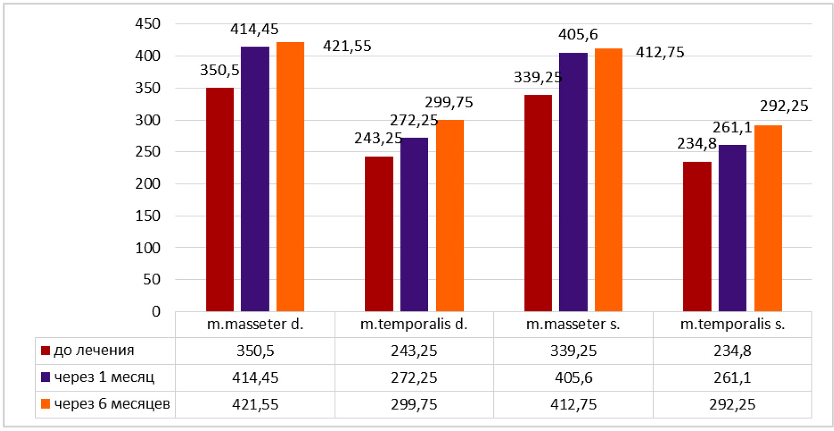 Через 1 месяц после лечения получили, что в основной группе средняя амплитуда электромиографии в мкВ составила: для правой стороны собственно жевательной мышцы 454,65 ± 2,50 и височной мышцы 304,9 ± 5,84; для левой стороны собственно жевательной мышцы 434,9 ± 5,84 и височной мышцы 296,65 ± 2,41. Через 1 месяц после лечения получили, что в контрольной группе средняя амплитуда электромиографии в мкВ составила: для правой стороны собственно жевательной мышцы 374,8 ± 10,42 и височной мышцы 291 ± 9,42; для левой стороны собственно жевательной мышцы 351,4 ± 12,24 и височной мышцы 273,1 ± 8,44 (при p < ,05).