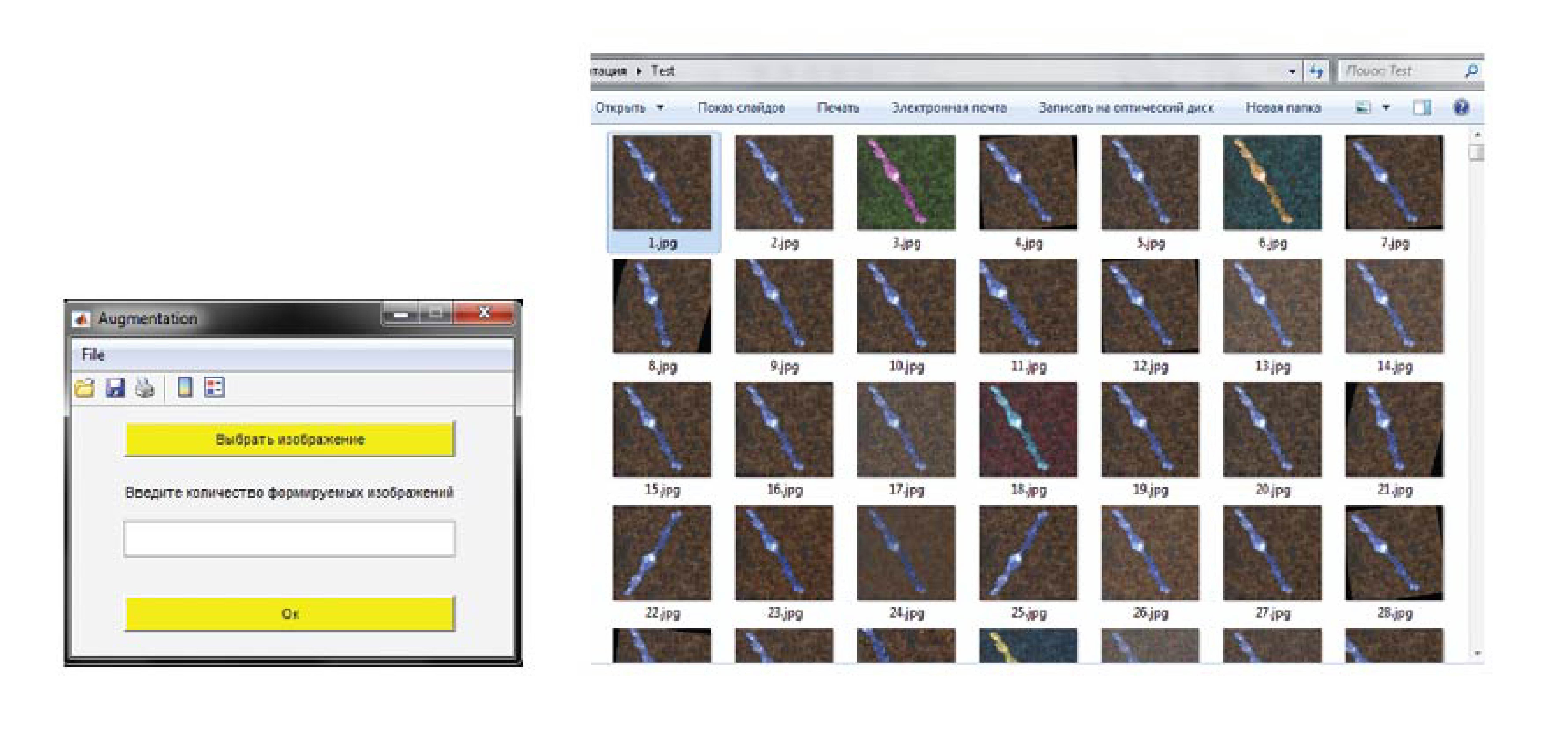 Требуемое количество формируемых изображений определяет пользователь и вводит с клавиатуры. Последовательность видов преобразований, как и параметры каждого из них, определяются случайным образом. В результате выполнения программы пользователь получает сохраненный в каталог набор измененных изображений, полученных из исходного, который в дальнейшем может быть использован в качестве обучающего набора данных для нейронной сети. На рис. 2 приведен интерфейс программы и результат ее выполнения.