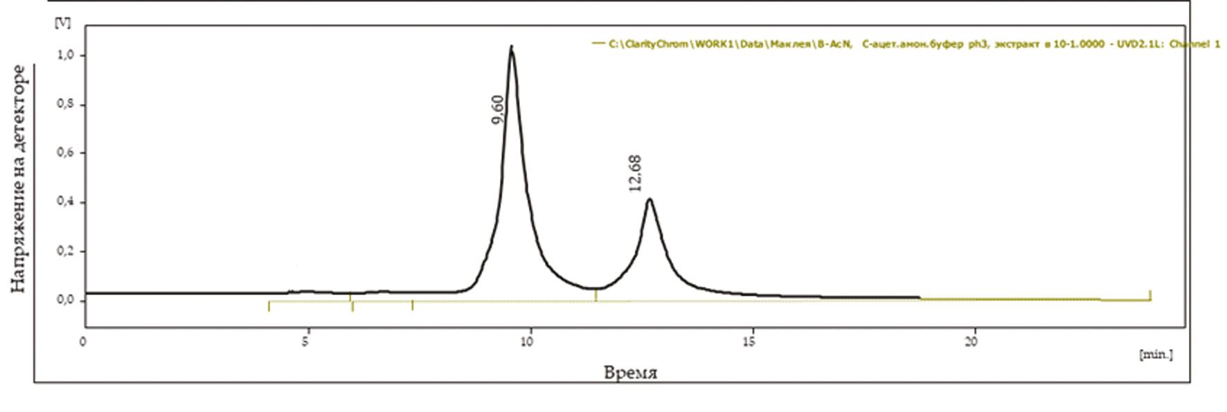 Следующим этапом опробована подвижная фаза: 60 % 0,01М ацетат аммония рН~3 и 40 % ацетонитрила, изократический режим (рис. 2).