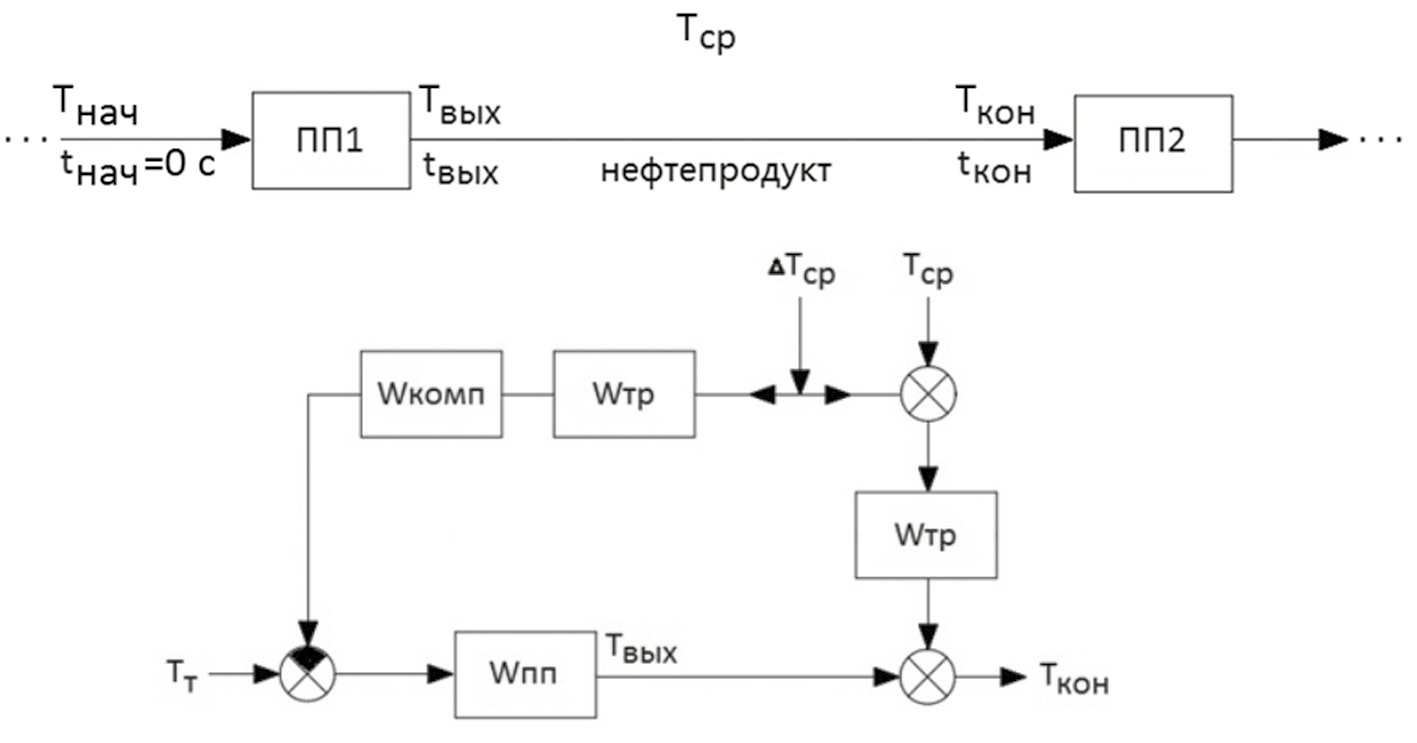 Рис. 1. Технологическая схема нагрева нефтепродукта в путевых подогревателях и структурная схема САУ: Wпп — передаточная функция процесса нагрева нефти внутри ПП 1; Wтр — передаточная функция процесса остывания нефти между ПП 1 и ПП 2; Wкомп — передаточная функция компенсационного элемента; Tт — температура в топке; ΔTср — помеха в виде постоянно меняющейся температуры окружающей среды